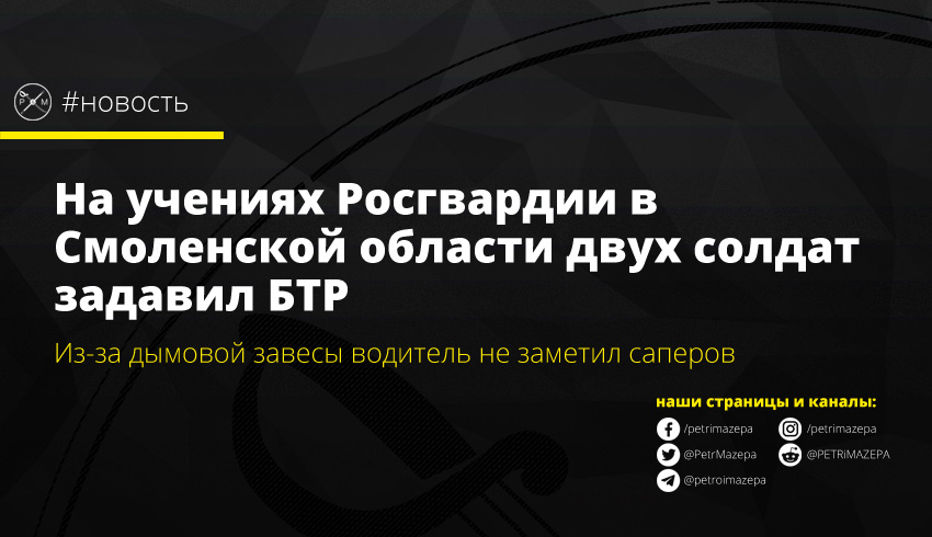 На тактико-специальных учениях Росгвардии в Смоленской области, 16 сентября, БТР наехал днем на двух саперов, который выполняли проверку местности на наличие взрывоопасных предметов. Двое военнослужащих получили травмы. К утру следующего дня один из них умер в больнице.