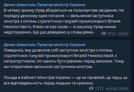Поэтому уже после полуночи премьер-министр Денис Шмыгаль добрался до своего Telegram-канала и пообещал, что с утра пройдет внеочередное заседание Кабмина. А в 9:44 21 января сообщил, что Немилостивый уже уволен.