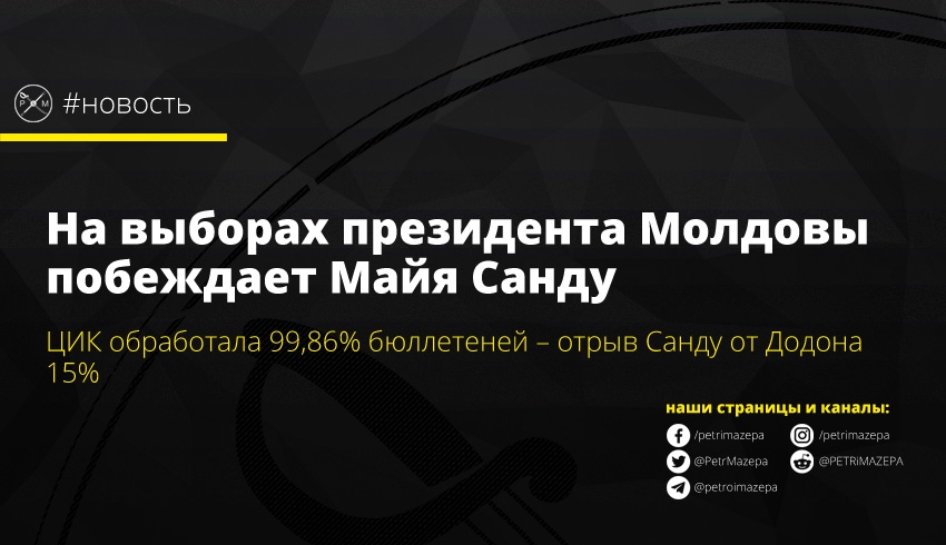 - 15 ноября в Молдове прошел второй тур выборов президента. Граждане Молдовы выбирали между Игорем Додоном (32,61% в первом туре) и лидером партии «Действие и солидарность» (PAS) Майей Санду (36,16%). ЦИК отмечает массовую мобилизацию избирателей, а в сети уже появились кадры, как в Приднестровье подкупают голосующих. Что привело к столкновениям на пункте пропуска в Варнице.