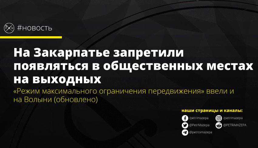 Обновлено: в Волынской области также сообщили о введении режима максимального ограничения передвижения. Глава Волынской ОГА Юрий Погуляйко призвал всех жителей области с 13:00 субботы до 6:00 понедельника не посещать общественные места, а лучше всего и вовсе не покидать дома.