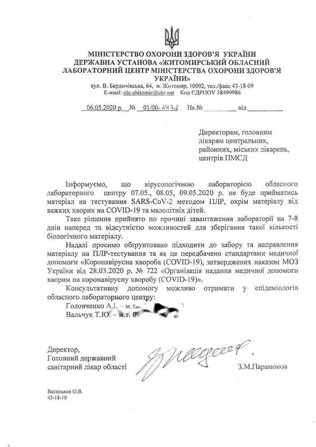 Об этом говорится в письме главного санитарного врача области Зиновия Парамонова, обнародованное Житомир.info. «Вирусологическая лаборатория областного лабораторного центра 07.05, 08.05, 09.05.2020 г. не будет принимать материал на тестирование SARS-CoV-2 методом ПЦР, кроме материала от тяжелобольных COVID-19 и малолетних детей. Такое решение принято по причине загруженности лаборатории на 7-8 дней наперед и отсутствием возможностей для хранения такого количества биологического материала», - сказано в документе.