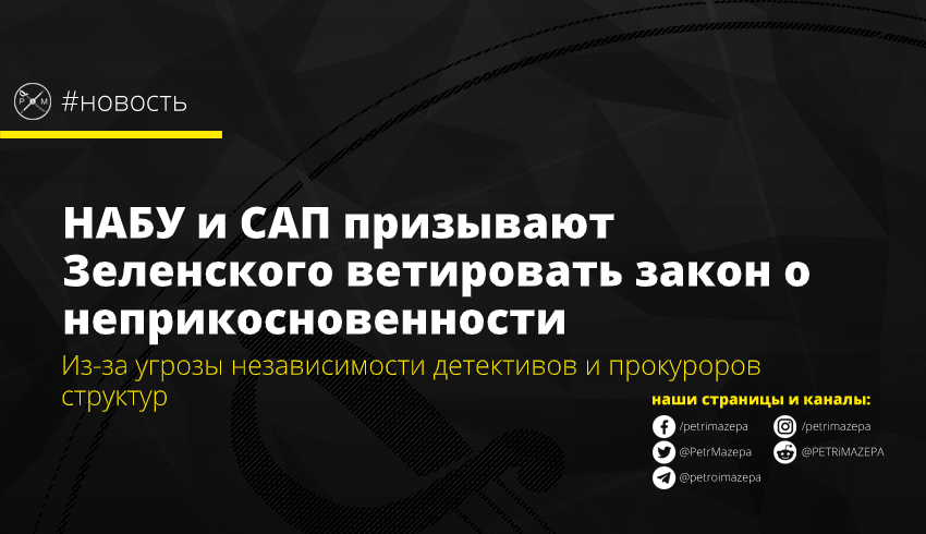 Национальное антикоррупционное бюро совместно со специализированной антикоррупционной прокуратурой выступили с заявлением, в котором призывают президента Владимира Зеленского ветировать законопроект №2237 о «якобы снятии депутатской неприкосновенности».