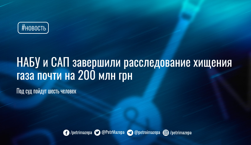 Национальное антикоррупционное бюро (НАБУ) и Специализированная антикоррупционная прокуратура (САП) завершили досудебное расследование хищения газа на сумму 196,8 млн гривен. Под суд пойдут шесть человек.