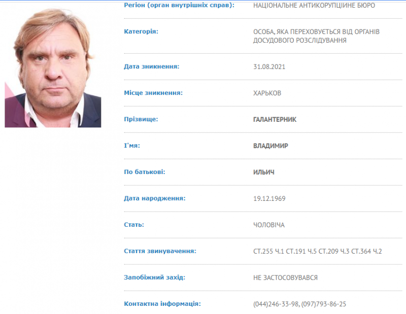 Согласно карте розыска, 51-летний Галантерник пропал в Харькове 31 августа 2021 года и до сих пор скрывается от органов досудебного расследования. В НАБУ «Украинской правде» уточнили, что подозреваемый был объявлен в розыск 27 октября.