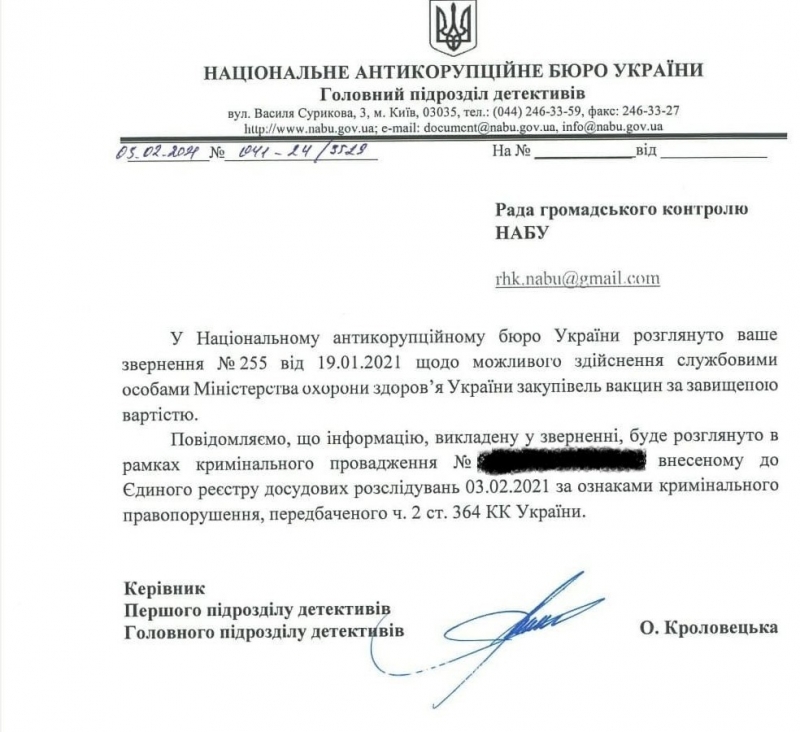 По данным Совета, ГП «Медичні закупівлі» начало переговоры касательно закупки вакцины с ориентировочной стоимостью в 3 доллара за 1 дозу, и переговоры находились уже на финальном этапе. «Однако позже министр Максим Степанов в ручном режиме остановил этот процесс и поручил начать переговоры касательно закупок китайской вакцины у компании Sinovac Biotech», - информирует СОК НАБУ.