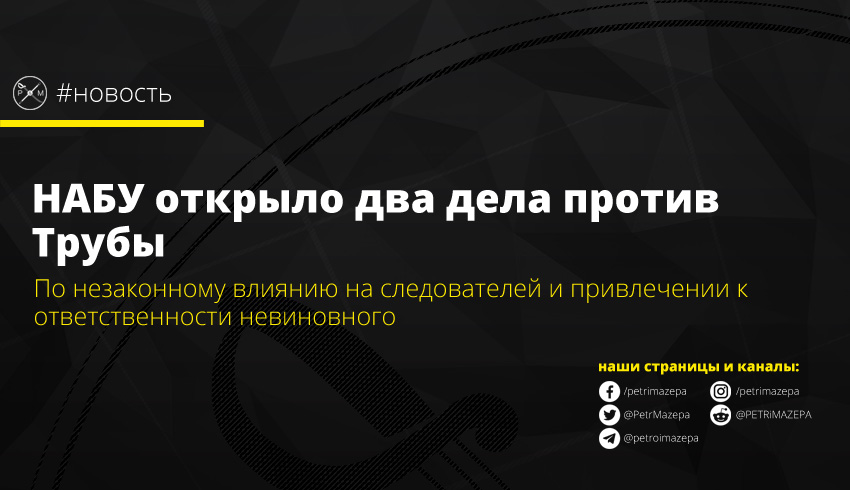 НАБУ будет расследовать возможные преступления Трубы, предусмотренные ст. 369-2 (злоупотребление влиянием) и ст. 372 (привлечение заведомо невиновного к уголовной ответственности, соединенное с фиктивным созданием доказательств обвинения) Уголовного кодекса.