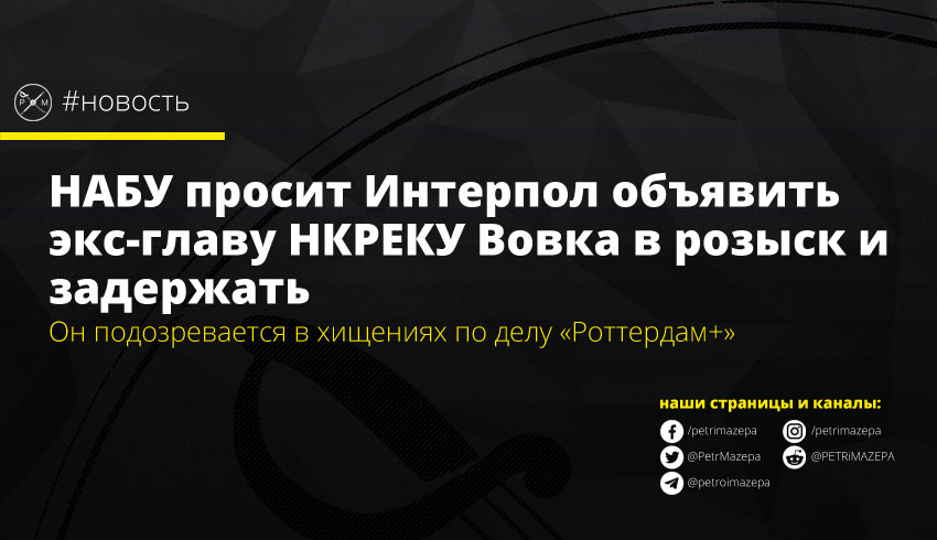 НАБУ обратилось в Интерпол касательно розыска и ареста экс-главы Национальной комиссии госрегулирования энергетики и коммунальных услуг (НКЭКУ) Дмитрия Вовка, подозреваемого в хищениях средств по делу «Роттердам+».