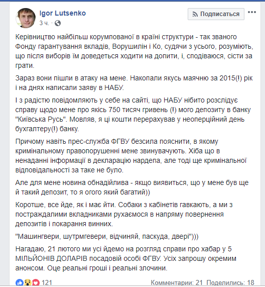 Пресс-служба Фонда гарантирования вкладов физических лиц (ФГВФЛ) сообщает, что НАБУ занялось проверкой информации о том, что народный депутат Игорь Луценко, в лучших традициях олигархов, в ночь перед введением временной администрации в ликвидируемый банк вывел 750 тыс грн со своего счета и не указал их в декларации.