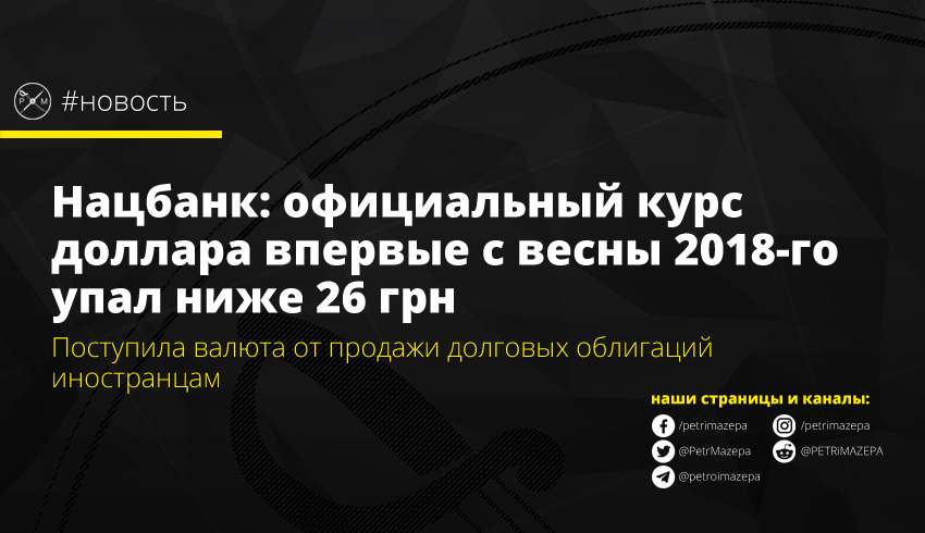Впервые с 13 апреля 2018 года официальный курс доллара в Украине опустился ниже отметки 26 гривен за доллар. Одной из причин происходящего специалисты называют поступления от продажи долговых облигаций иностранцам в валюте.