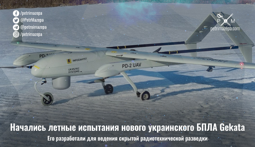 Научно-производственный центр «ІНФОЗАХИСТ» начал летные испытания украинского воздушного комплекса радиотехнической разведки Gekata. БПЛА создан на базе PD-2 от Ukrspecsystems.