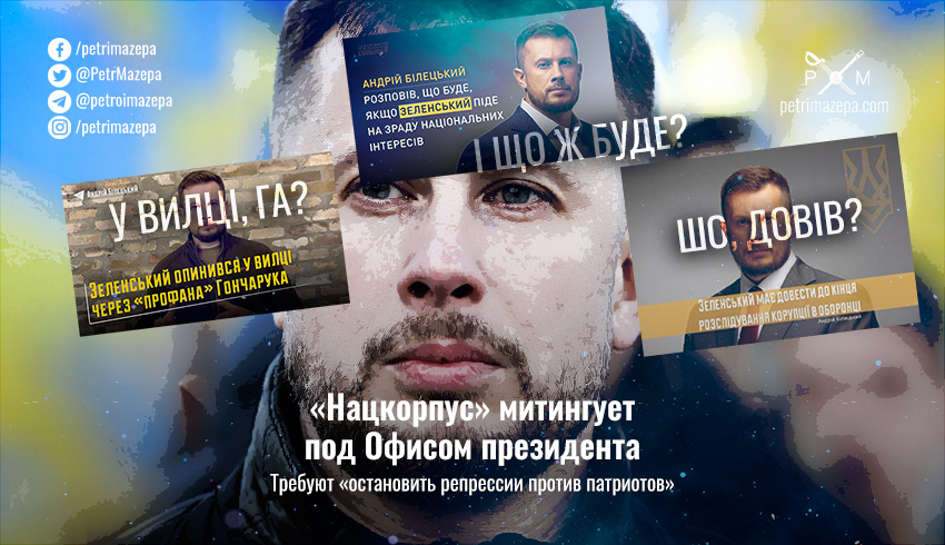 «Нацкорпус» проводит акцию под Офисом президента, чтобы «остановить репрессии против патриотов».  На акцию вышли после того, как в Харькове арестовали представителей «Нацкорпуса», подозреваемых в вымогательстве.