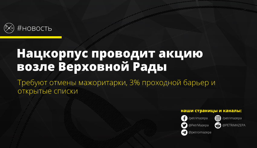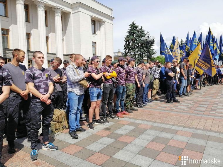 Более 400 представителей партий «Национальный Корпус», «Свобода» и члены «Национальных дружин» собрались под зданием Верховной Рады Украины с требованием принять поправки, касающиеся отмены мажоритарной системы.