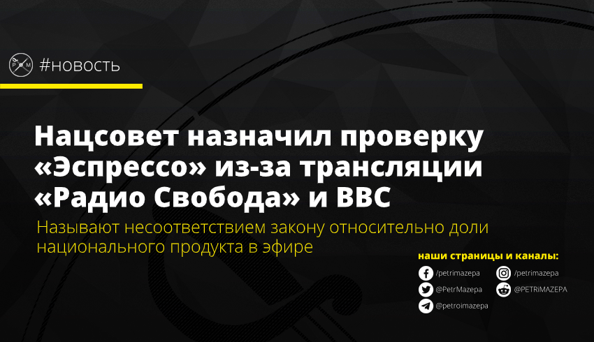 Нацсовет по вопросам телевидения и радио назначил проверку телеканалу «Эспрессо» из-за трансляции украинской службы «Радио Свобода» и BBC NEWS Украина. Объясняют это тем, что телеканал не выполняет требования закона относительно доли национального продукта в телеэфире.