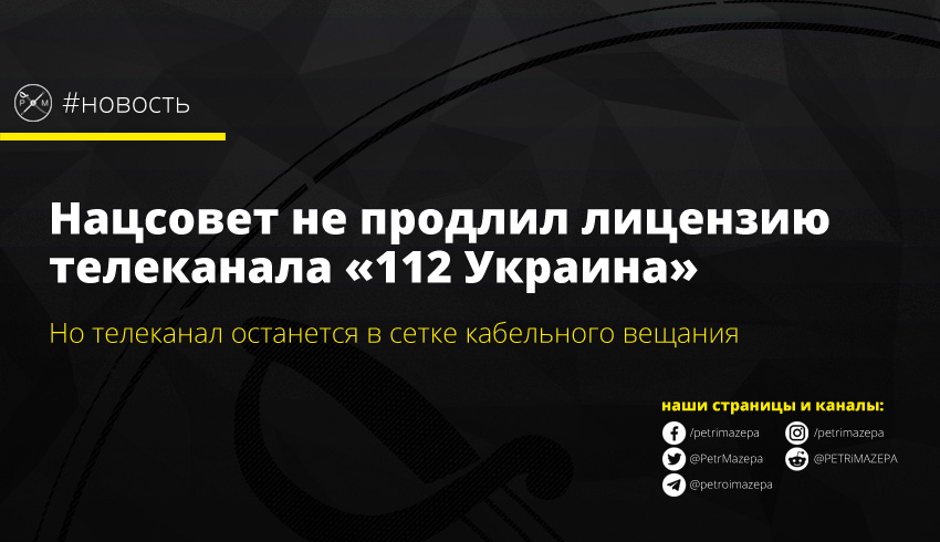 Национальный совет по вопросам телевидения и радиовещания отказался продлевать лицензию телеканалу «112 Украина». В Нацсовете утверждают, что вещание телеканала не прерывается и он остается в сетке кабельного вещания, а речь идет о не продлении лицензий для ряда региональных каналов.