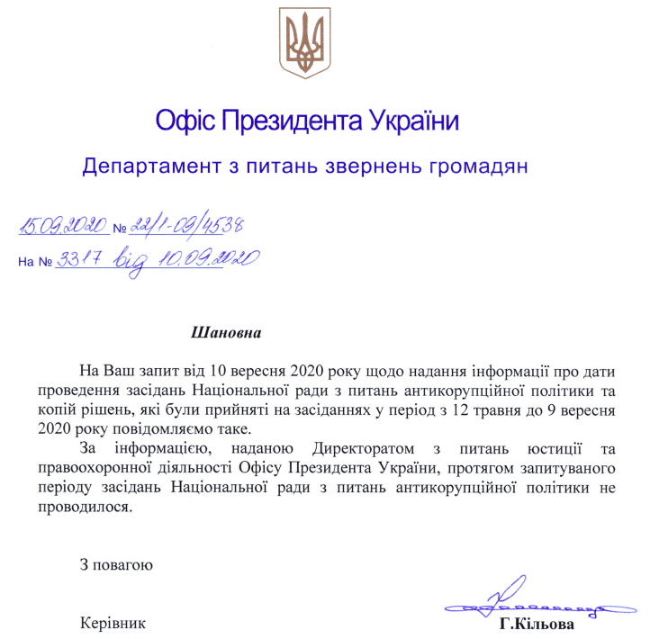 При этом в июне 2020 года президент провел кадровые изменения в Нацсовете по антикоррупционной политике и лично его возглавил. Судя по ответам из ОПУ, как минимум до 9 сентября Нацсовет во главе с президентом ни разу не собирался.