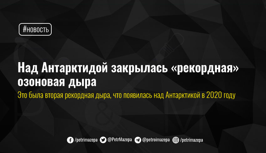 В конце декабря 2020 года над Антарктикой окончательно закрылась озоновая дыра рекордных размеров – она была одной из самых длительных, наиболее крупных и глубоких дыр за сорок лет наблюдений. Это уже вторая озоновая дыра рекордных размеров, появившаяся над Антарктикой в 2020 году.