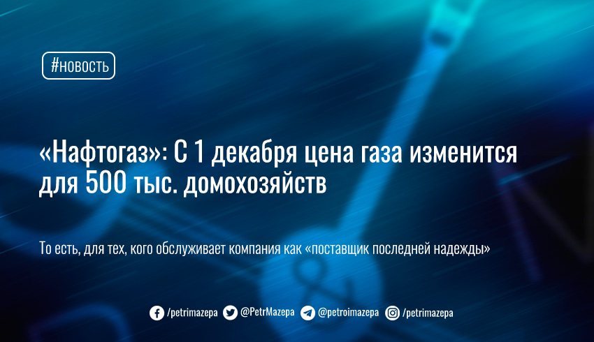 Государственная компания «Нафтогаз України», которая выполняет функции «поставщика последней надежды» (ППН), предупредила, что льготная цена газа на уровне 7,96 гривни за кубометр для бытовых клиентов действует только до 30 ноября. С 1 декабря цены для 500 тысяч домохозяйств по всей Украине изменятся.