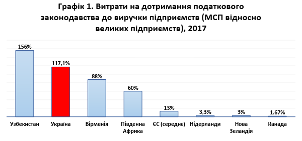 В Україні співвідношення витрат на дотримання податкового законодавства до виручки для малих та середніх підприємств на 117% вище, ніж для великих. У країнах ЄС — це 13%, в Новій Зеландії — 3%, а в Канаді — 1,7%. В країнах з низькою якістю адміністрування податків та високими витратами на дотримання податкового законодавства бути малим — дорого і складно.