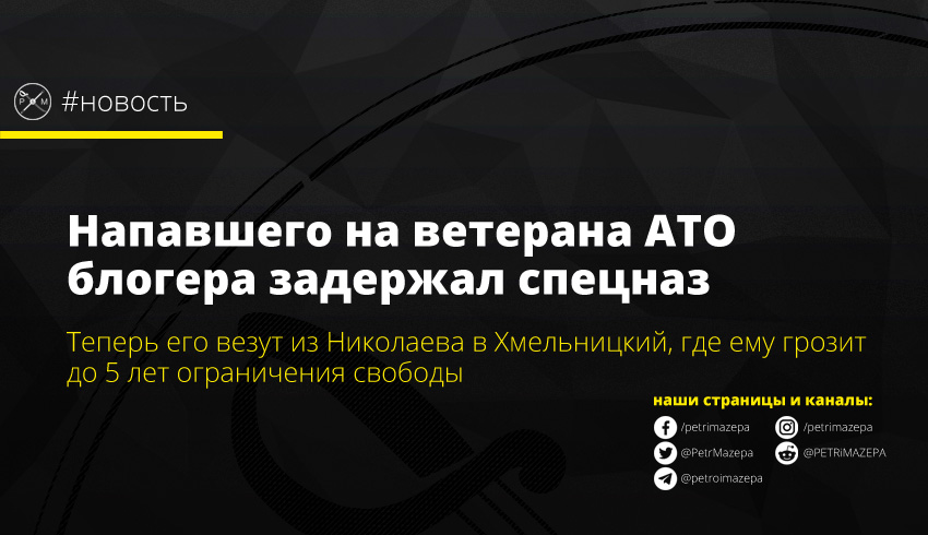 В субботу представители уголовного розыска и спецназа задержали в Николаеве скандального блогера Артура Сороченко, который снял видео с издевательствами и нападением на участника АТО. Теперь задержанного доставят в Хмельницкий (по месту совершения преступления) для избрания меры пресечения.