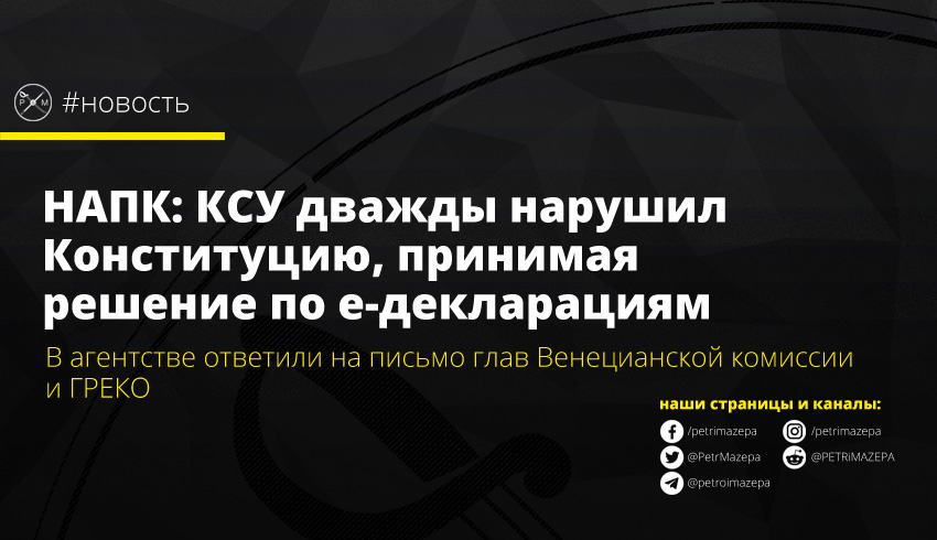 В Национальном агентстве по предупреждению коррупции (НАПК) отреагировали на заявление глав Венецианской комиссии и GRECO о необходимости воздержаться от роспуска Конституционного суда Украины (КСУ) и призывов к скорейшему восстановлению работы антикоррупционных органов. По мнению НАПК, КСУ дважды нарушил Конституцию и сделал невозможным введение криминальной ответственности за подачу недостоверных деклараций.