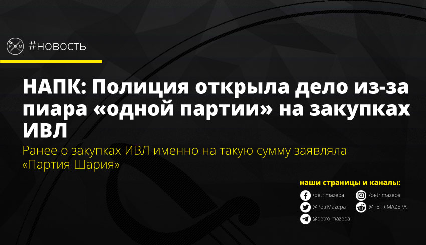 Национальное агентство по предотвращению коррупции (НАПК) передало в Нацполицию материалы касательно одной партии, которая разместила в соцсетях информацию о якобы закупленных ими аппаратов ИВЛ на более чем 9 млн грн, потому что в отчете эти траты указаны не были, а у партии даже по отчету не было таких доходов. Ранее о закупках ИВЛ именно на такую сумму заявляли в «Партии Шария».
