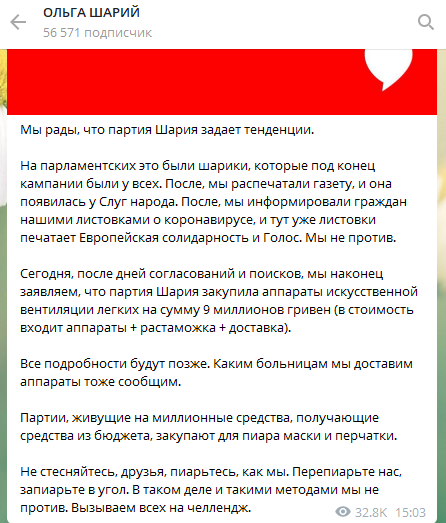 Ранее о закупках ИВЛ на такую сумму (более 9 млн грн) сообщала «Партия Шария», о чем писала Ольга Шарий в Telegram, также эти данные были размещены на официальном сайте политсилы.