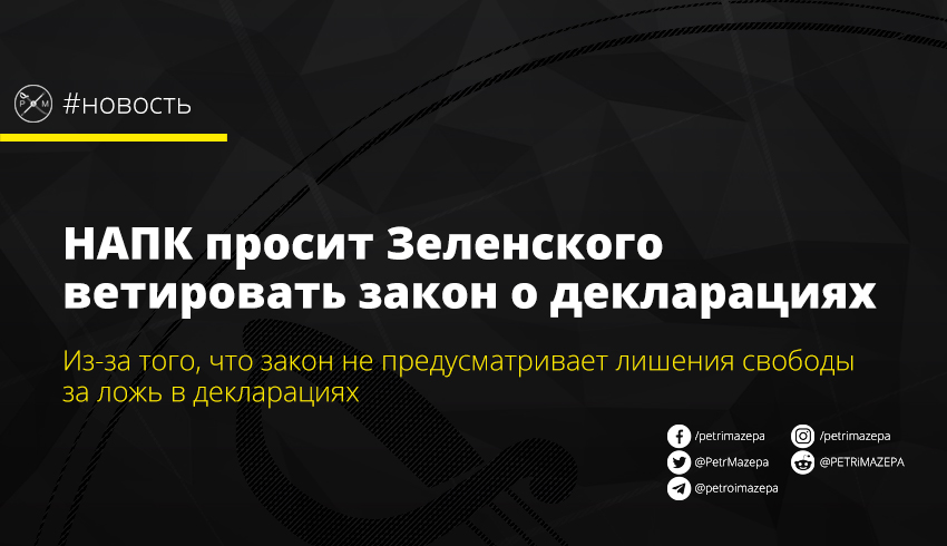 Глава Национального агентства по вопросам предотвращения коррупции Александр Новиков призвал президента Владимира Зеленского ветировать принятый сегодня законопроект №4460-д об ответственности за недостоверное декларирование.