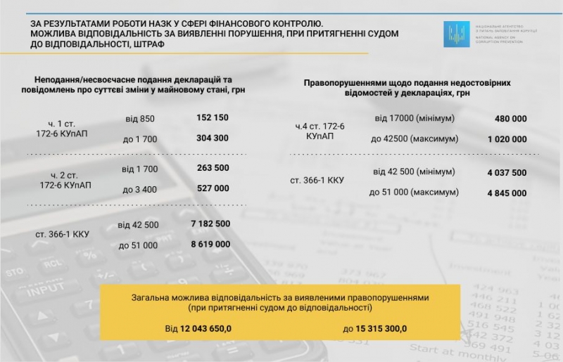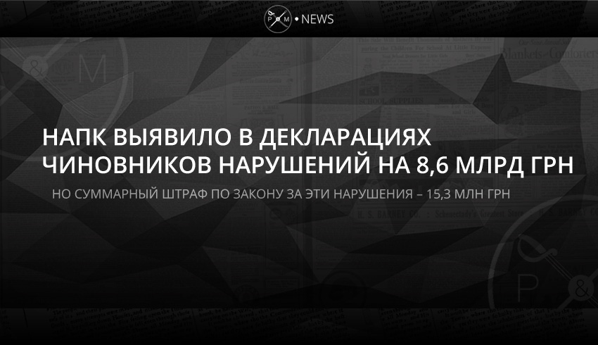 Уполномоченные лица НАПК, по результатам полных проверок деклараций должностных лиц обнаружили недостоверные сведения на общую сумму более 8,6 млрд грн. Выводы проверок были переданы в следственные органы, но даже суммарный максимальный штраф по направленным в суд протоколам - 15,3 млн грн.