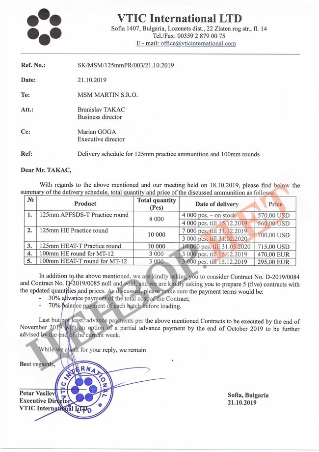 Также нардеп сообщает генпрокурору, что 19 октября 2020 года между МО Украины и ГП «Укрспецэкспорт» был заключен госконтракт № 403/1/20/74 на поставку 5000 выстрелов УОФ12. Общая стоимость сделки достигла 126,5 млн грн или же 760 евро за штуку. В качестве поставщика указана компания Czech Defense Systems a.s.