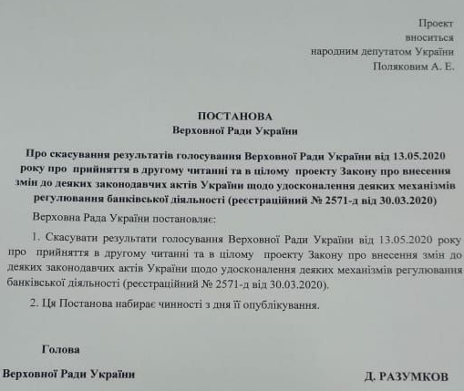 - 13 мая нардепы 270 голосами приняли во втором чтении и в целом проект Закона «О внесении изменений в некоторые законодательные акты Украины по отдельным вопросам функционирования банковской системы», №2571-Д, который более известен как «анти-Коломойский».