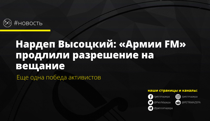 Нардеп от «Народного фронта» Сергей Высоцкий сообщил, что сегодня Нацсовет Украины по вопросам телевидения и радиовещания внял призывам общественности, военных и активистов и выполнил свои обязанности, проголосовав за продление разрешения на вещание единой военной радиостанции «Армия FM».
