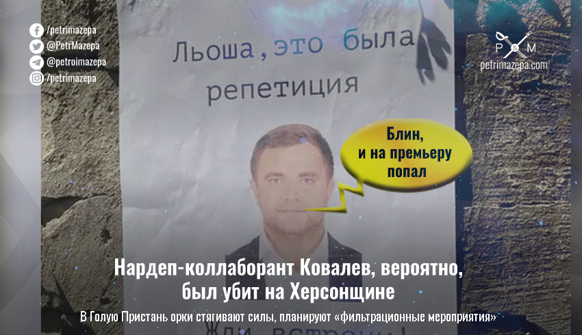 В собственном Telegram-канале Соболевский также подчеркнул, что орки планируют проводить в Голой Пристани, где, скорее всего, и был убит нардеп Ковалев, фильтрационные мероприятия, туда уже стянули дополнительные силы.