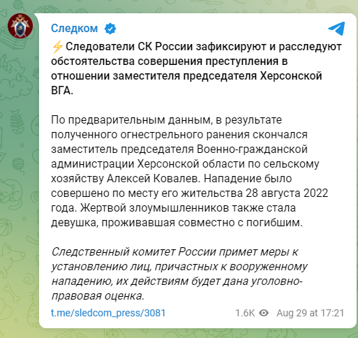 Оккупанты подтвердили смерть Ковалева. Также скончалась в больнице и его сожительница. Следственный комитет РФ делает вид, что успеет расследовать кончину Ковалева на оккупированной части Херсонщины.