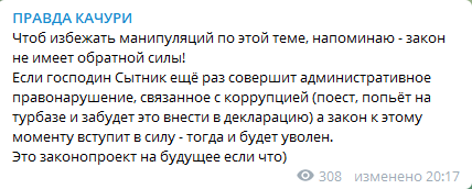 «В случае вступления в законную силу решения суда о привлечении директора НАБУ к административной ответственности за административное правонарушение, связанное с коррупцией, директор НАБУ может быть освобожден от должности решением Верховной Рады Украины», - сказано в записке. В комментариях в Facebook пользователи отмечают, что данным законопроектом «слуги» пытаются сделать так, чтобы закон имел обратную силу. На это также отреагировал один из инициаторов законопроекта Александр Качура у себя в Telegram-канале. «Чтоб избежать манипуляций по этой теме, напоминаю - закон не имеет обратной силы! Если господин Сытник ещё раз совершит административное правонарушение, связанное с коррупцией (поест, попьёт на турбазе и забудет это внести в декларацию) а закон к этому моменту вступит в силу - тогда и будет уволен. Это законопроект на будущее если что», - написал он.