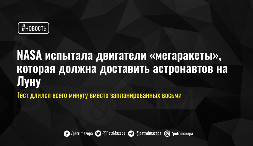 Американское аэрокосмическое агентство NASA испытало четыре двигателя «мегаракеты», которая должна доставить на Луну астронавтов в рамках программы «Артемида». Испытания продолжались значительно меньше, чем было запланировано изначально – тест длился всего минуту вместо восьми.