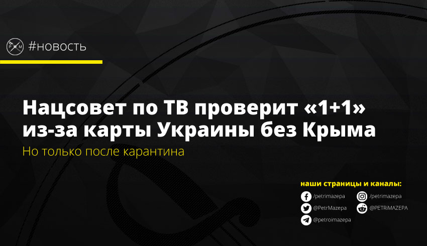 Национальный совет по вопросам телевидения и радиовещания назначил внеочередную проверку телеканала «1+1» из-за показа в эфире карты Украины без оккупированного РФ Крыма. Проверка будет проведена после завершения карантина.