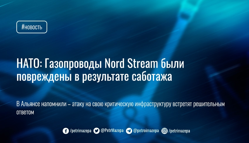 Североатлантический альянс выпустил официальное заявление о повреждениях на газопроводах North Stream 1 и North Stream 2 — по их данным, утечки стали следствием умышленного саботажа. НАТО поддерживает расследование причин повреждений на газопроводах, и напоминает, что любая преднамеренная атака на критически важную инфраструктуру стран НАТО спровоцирует решительный ответ.