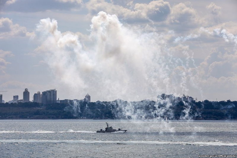 Водночас працювала ще одна тактична група. На рейді Одеського порту малі броньовані артилерійські катери (МБАКи) ВМС України, корабель і катери морської охорони Державної прикордонної служби провели навчання з оборони пункту базування, а на морському полігоні поблизу Тендрівської коси (Херсонська область) виконали практичні артилерійські стрільби по берегових цілях, вправи із протидиверсійної оборони корабля тощо.