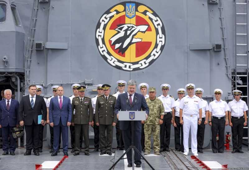Президент України Петро Порошенко під час виступу на фрегаті «Гетьман Сагайдачний». Одеса, 16 липня 2018 року