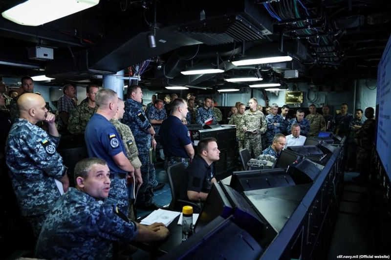 Робота багатонаціонального штабу на борту флагмана Шостого флоту USS Mount Whitney (LCC 20). 10 липня 2018 року