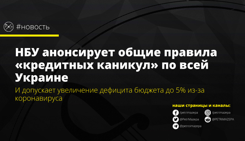 На брифинге топ-менеджеры Национального банка Украины (НБУ) сообщили, что очень скоро будут представлены стандартные правила «кредитных каникул» для всех видов бизнеса и физлиц. Также из-за коронавируса в НБУ допускают, что дефицит госбюджета может выйти из целевого диапазон до 2% и составить 3-5% по итогам 2020 года.