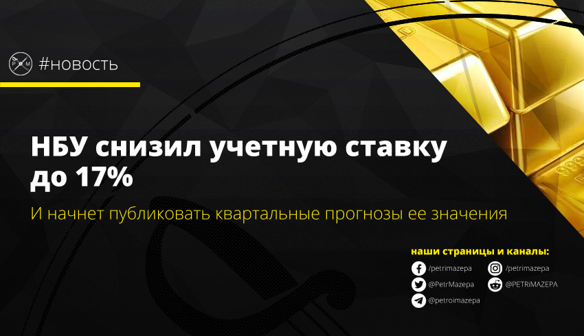 После небольшой паузы Правление Национального банка Украины (НБУ) продолжило зарождающуюся традицию снижения учетной ставки. В этот раз был сделан осторожный шажок на 0,5% до 17,0% годовых с 19 июля 2019 года. Также в НБУ решили ежеквартально выдавать прогноз учетной ставки, чтобы повысить «ясность и предсказуемость монетарной политики для участников рынка» и сделать ее более эффективной.