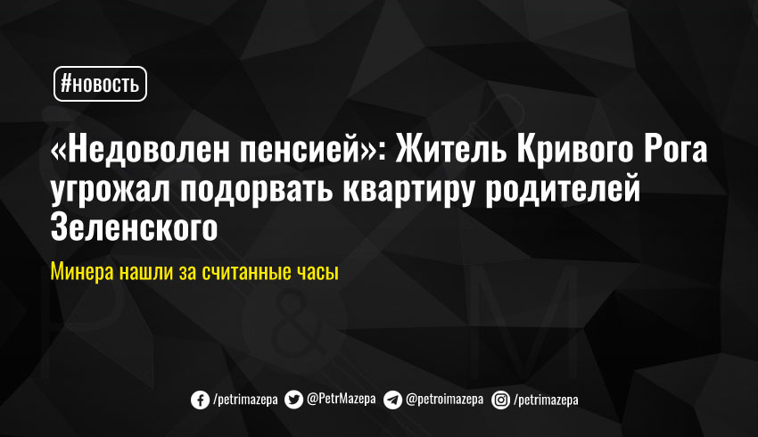 В Кривом Роге правоохранители задержали мужчину, угрожавшего подорвать квартиру в многоэтажке, где проживают родители президента Владимира Зеленского. Найденный за считанные часы «минер» по данным СМИ сначала заявил, что сообщил о минировании из-за недовольства размером своей пенсии. Позже он показания изменил, сообщив что просто хотел лично встретиться с президентом.
