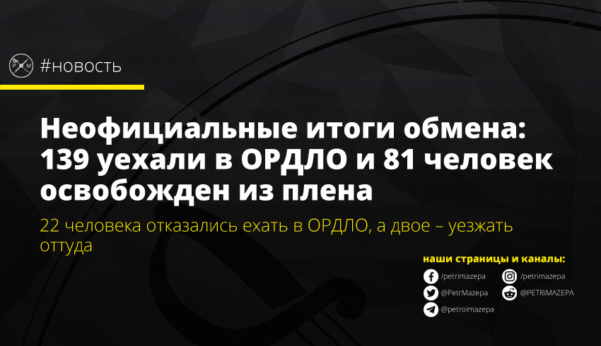 В рамках обмена в Украину вернется 81 человек, в ОРДЛО отдали 139 человек. «Это окончательные цифры. Обмен закончен», - сообщил источник 112.ua, участвующий в обмене удерживаемыми.