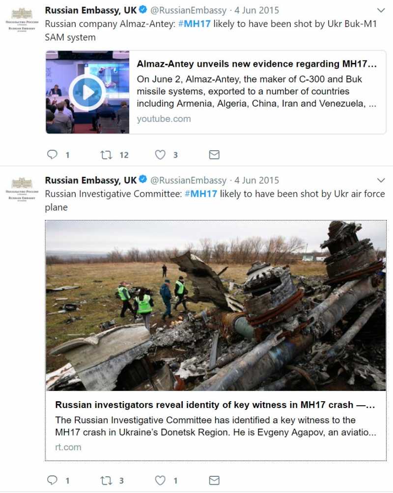 После девяти минут изложения кремлёвский версии о том, как «Боинг» был сбит украинским «Буком», в репортаже внезапно начинают рассказывать о том, как MH17 сбил украинский пилот Су-25 капитан Владислав Волошин. Сразу после этого упоминается пост в ЖЖ, в котором говорится, что Украина сбила MH17 израильской ракетой «воздух – воздух». Противоречия различных версий в этом кратком репортаже так и не разрешаются. Суть информационной стратегии Кремля по сбитию MH17 можно описать в двух твитах, написанных в один и тот же день аккаунтом российского посольства в Великобритании: