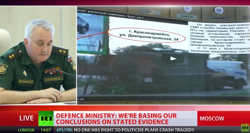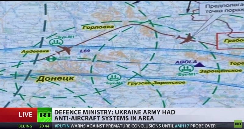 21 июля 2014 года, через четыре дня после гибели MH17, Минобороны России провело пресс-конференцию, на которой было выдвинуто сразу несколько версий трагедии. Вместо чёткой и ясной теории о причине гибели «Боинга» МО РФ представило несколько взаимопротиворечащих заявлений, возлагающих вину на украинские власти.