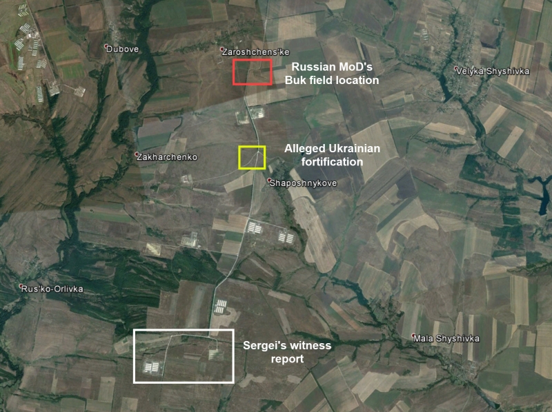 Возможно, что Сергей действительно видел украинскую технику рядом с птицефермой в 6 километрах к югу от Зарощенского 17 июля 2014 года, поскольку, согласно ранее проведённым исследованиям Bellingcat, в середине июля 2014 года этот район не контролировался ни Украиной, ни Россией/сепаратистами. Однако в описании Сергея не говорится о присутствии каких-либо элементов комплекса «Бук» среди этой техники. Само описание техники опровергает версию Кремля, поскольку упоминается «купол» на якобы присутствовавших там радарах.