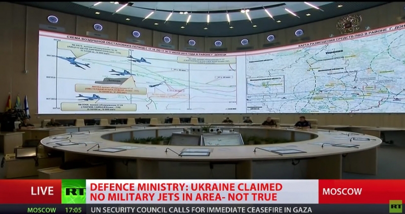 - во время катастрофы рядом с MH17 был замечен украинский самолёт, о чём свидетельствуют данные российских радаров [в 2016 году МО РФ провело в том же зале ещё одну пресс-конференцию о недавно «обнаруженных» новых данных радаров; никакого «украинского самолёта» на них не оказалось];