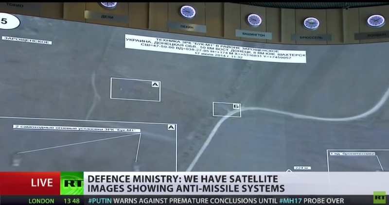 - незадолго до гибели MH17 украинская самоходная огневая установка «Бук» была выведена с базы в районе посёлка Спартак под Донецком и передислоцирована в поле к югу от села Зарощенское, где она, ещё одна СОУ «Бук» и ещё одна единица военной техники были размещены 17 июля 2014 года [представленные Минобороны спутниковые снимки были подробно разоблачены. Сначала команда Bellingcat приобрела спутниковый снимок, сделанный практически в то же время, что указано на снимке МО РФ, и обнаружила серьёзные отличия между ними; затем доктор Джеффри Льюис и его команда в Институте международных исследований Миддлбери с помощью продвинутого инструмента цифрового анализа убедительно доказали, что российские спутниковые снимки подверглись значительному цифровому монтажу].