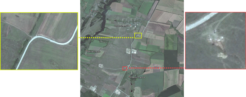 Эта СОУ, как сообщается, находилась в 53,5 км (по прямой) от этой базы в поле к югу от села Зарощенское. Сообщается, что оба спутниковых снимка были сделаны в одно и то же время.